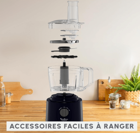 | Accessories and Parts | 6 essential accessories: a chopping blade, a kneading knife, an emulsion disc, a grater cartridge, a slicing cartridge, and a parmesan cartridge. |